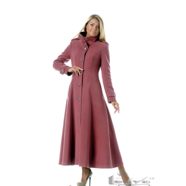 Довге елегантне пальто розширене до низу з шовковим шарфом в комплекті. Пальто прилеглого силуету, відрізний по талії, з підкладкою, без утеплювача. Комір - асиметрична стійка. Застібка центральна на ґудзики з петлями. Рукави втачні, двошовні. По низу рукавів пати з ґудзиком. На плечові шви нашиті погони. Кишені в бічних швах нижньої частини пальто. По контуру кишень прострочені оздоблювальні строчки.