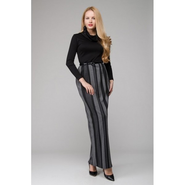 Елегантна довга сукня в підлогу з чорним верхом і вертикальними сіро-чорними смугами по низу. Вона зробить Вас стрункішою.