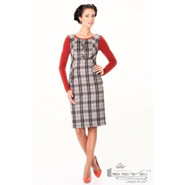 Сарафан ділового стилю з костюмної тканини в клітинку. Сарафан напівприлягаючого силуету, прямий до низу. Горловина кругла. В центрі переду розташована застібка-планка - на ґудзики з петлями. Кишені з оздоблювальними клапанами закладені в рельєфних підрізах переду. Потайна застібка блискавка - в бічному шві. По центральному шву спинки - шліца. Сарафан з підкладкою.