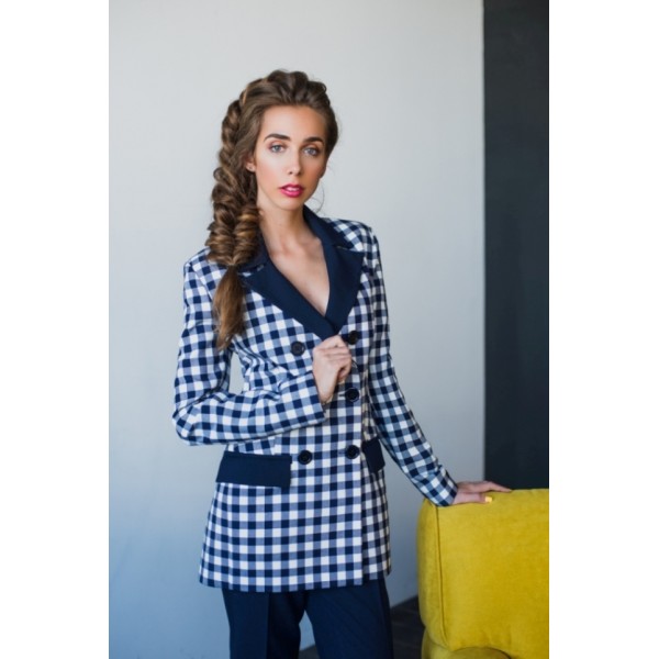 Жіночий діловий костюм в яскраву клітинку. Жакет напівприлягаючого силуету, короткий. Горловина кругла. Застібка центральна на ґудзики з петлями. На лівій поличці - нагрудна кишеня-обманка. Нижні функціональні кишені - настрочні листочки. Рукави довгі, втачні, двошовні. По центру спинки настрочений хлястик з ґудзиками. Жакет з жовтою підкладкою. Спідниця прилеглого силуету, завужена до низу. Верх спідниці оброблений притачним поясом з гумками по боках. Потайна застібка блискавка і шліца розташована по центральному шву спинки. Спідниця також з жовтою підкладкою.Барвотип Зима Тип фігури Х-фігура,